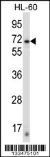 ZNF415 Antibody (N-term) (Cat. APR03825G) western blot analysis in HL-60 cell line lysates (35ug/lane).This demonstrates the ZNF415 antibody detected the ZNF415 protein (arrow). |