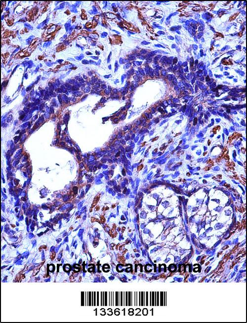 ACTG2 Antibody (C-term) (Cat. APR03831G)immunohistochemistry analysis in formalin fixed and paraffin embedded human prostate cancinoma followed by peroxidase conjugation of the secondary antibody and DAB staining.This data demonstrates the use of ACTG2 Antibody (C-term) for immunohistochemistry. Clinical relevance has not been evaluated. |