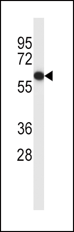 ESR1/ER Antibody (Center) (Cat. APR03834G) western blot analysis in MCF-7 cell line lysates (35ug/lane).This demonstrates the ESR1/ER antibody detected the ESR1/ER protein (arrow).