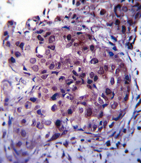ESR1/ER Antibody (Center) (Cat. APR03834G)immunohistochemistry analysis in formalin fixed and paraffin embedded human breast carcinoma followed by peroxidase conjugation of the secondary antibody and DAB staining.This data demonstrates the use of ESR1/ER Antibody (Center) for immunohistochemistry. Clinical relevance has not been evaluated. |