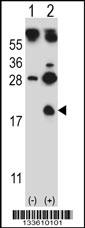 Western blot analysis of HBG1 (arrow) using rabbit polyclonal HBG1 Antibody (Center) (Cat. APR03847G). 293 cell lysates (2 ug/lane) either nontransfected (Lane 1) or transiently transfected (Lane 2) with the HBG1 gene.