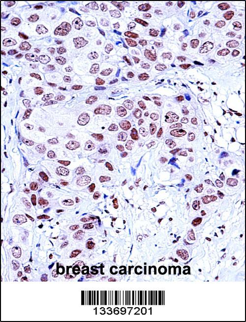 NCK1 Antibody (N-term) (Cat. APR03854G)immunohistochemistry analysis in formalin fixed and paraffin embedded human breast carcinoma followed by peroxidase conjugation of the secondary antibody and DAB staining.This data demonstrates the use of NCK1 Antibody (N-term) for immunohistochemistry. Clinical relevance has not been evaluated. |