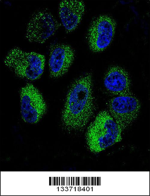 Confocal immunofluorescent analysis of IL13 Antibody (C-term) ( APR03858G) with NCI-H460 cell line followed by Alexa Fluor 488-conjugated goat anti-rabbit lgG (green). DAPI was used to stain the cell nuclear (blue).