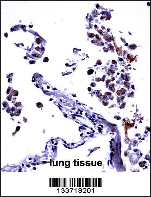IL13 Antibody (C-term) (APR03858G)immunohistochemistry analysis in formalin fixed and paraffin embedded human lung tissue followed by peroxidase conjugation of the secondary antibody and DAB staining.This data demonstrates the use of IL13 Antibody (C-term) for immunohistochemistry. Clinical relevance has not been evaluated. |