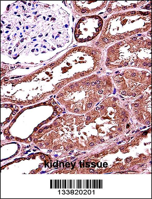 RANBP3L Antibody (Center) (Cat. APR03862G)immunohistochemistry analysis in formalin fixed and paraffin embedded human kidney tissue followed by peroxidase conjugation of the secondary antibody and DAB staining.This data demonstrates the use of RANBP3L Antibody (Center) for immunohistochemistry. Clinical relevance has not been evaluated. |