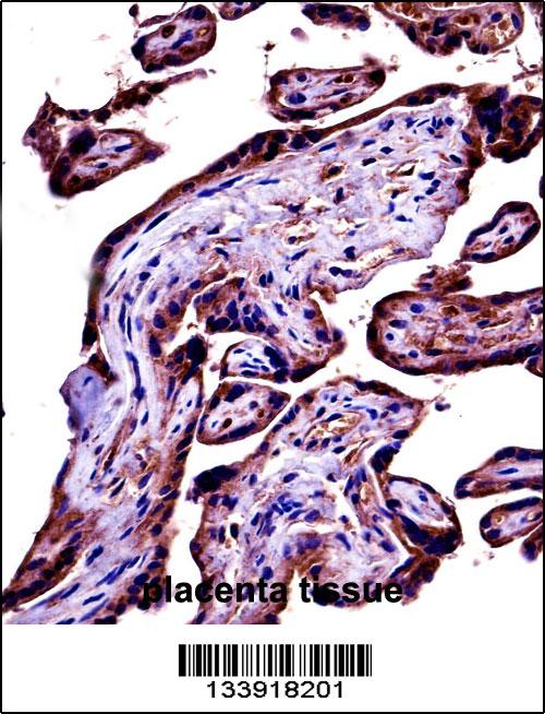 C9 Antibody (Center) (APR03866G)immunohistochemistry analysis in formalin fixed and paraffin embedded human placenta tissue followed by peroxidase conjugation of the secondary antibody and DAB staining.This data demonstrates the use of C9 Antibody (Center) for immunohistochemistry. Clinical relevance has not been evaluated. |