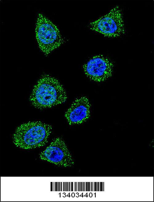 Confocal immunofluorescent analysis of TOP1 Antibody (N-term)( APR03883G) with Hela cell followed by Alexa Fluor 488-conjugated goat anti-rabbit lgG (green).DAPI was used to stain the cell nuclear (blue). |