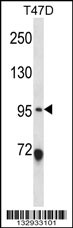 ANKS6 Antibody (Center) (Cat. APR03894G) western blot analysis in T47D cell line lysates (35ug/lane).This demonstrates the ANKS6 antibody detected the ANKS6 protein (arrow). |