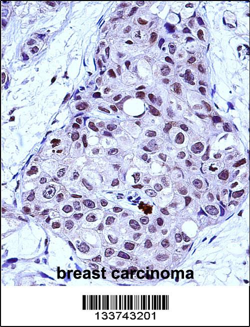 MYB Antibody (Center) (Cat. APR03896G)immunohistochemistry analysis in formalin fixed and paraffin embedded human breast carcinoma followed by peroxidase conjugation of the secondary antibody and DAB staining.This data demonstrates the use of MYB Antibody (Center) for immunohistochemistry. Clinical relevance has not been evaluated. |