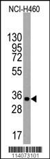 Western blot analysis of anti-UTF1 Antibody (Center L147) (RB14073) in NCI-H460 cell line lysates (35ug/lane). UTF1(arrow) was detected using the purified Pab. |