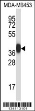PRSS8 Antibody (Center) (Cat. APR03924G) western blot analysis in MDA-MB453 cell line lysates (35ug/lane).This demonstrates the PRSS8 antibody detected the PRSS8 protein (arrow). |