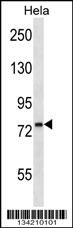PDIA4 Antibody (N-term) (Cat. APR03928G) western blot analysis in Hela cell line lysates (35ug/lane).This demonstrates the PDIA4 antibody detected the PDIA4 protein (arrow).