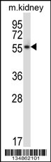 Mouse Plk5 Antibody (N-term) (Cat. APR03937G) western blot analysis in mouse kidney tissue lysates (35ug/lane).This demonstrates the Plk5 antibody detected the Plk5 protein (arrow). |