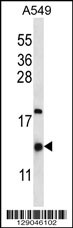 HIGD2A Antibody (N-term) (Cat. APR03947G) western blot analysis in A549 cell line lysates (35ug/lane).This demonstrates the HIGD2A antibody detected the HIGD2A protein (arrow). |
