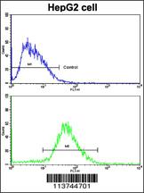 Flow cytometric analysis of HepG2 cells using H Cadherin (CDH13) Antibody (N-term)(bottom histogram) compared to a negative control cell (top histogram). FITC-conjugated goat-anti-rabbit secondary antibodies were used for the analysis. |