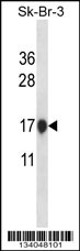 CSTB Antibody (Center) (Cat. APR03953G) western blot analysis in SK-BR-3 cell line lysates (35ug/lane).This demonstrates the CSTB antibody detected the CSTB protein (arrow). |