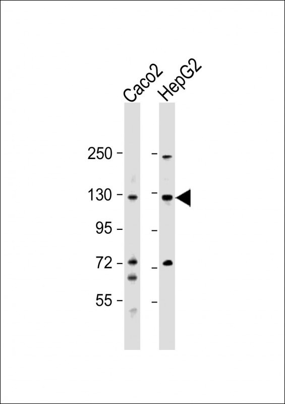 All lanes : Anti-UBE4A Antibody (Center) at 1:1000 dilution Lane 1: Caco2 whole cell lysate Lane 2: HepG2 whole cell lysate Lysates/proteins at 20 μg per lane. Secondary Goat Anti-Rabbit IgG, (H+L), Peroxidase conjugated at 1/10000 dilution. Predicted band size : 123 kDa Blocking/Dilution buffer: 5% NFDM/TBST.