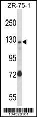 UBE4A Antibody (Center) (Cat. APR03994G) western blot analysis in ZR-75-1 cell line lysates (35ug/lane).This demonstrates the UBE4A antibody detected the UBE4A protein (arrow).