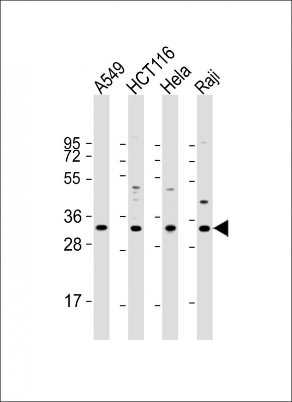 All lanes : Anti-CD274 Antibody (C-term) at 1:2000 dilution Lane 1: A549 whole cell lysate Lane 2: HCT116 whole cell lysate Lane 3: Hela whole cell lysate Lane 4: Raji whole cell lysate Lysates/proteins at 20 μg per lane. Secondary Goat Anti-Rabbit IgG, (H+L), Peroxidase conjugated at 1/10000 dilution. Predicted band size : 33 kDa Blocking/Dilution buffer: 5% NFDM/TBST.