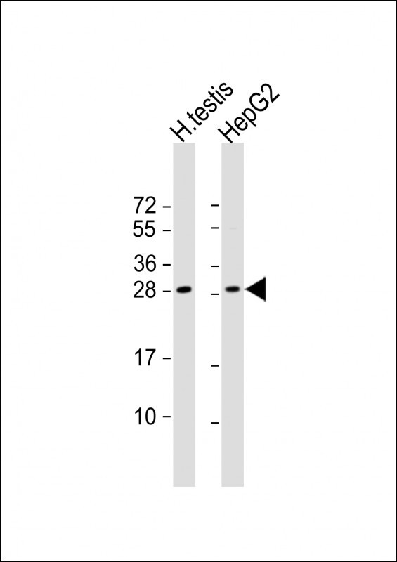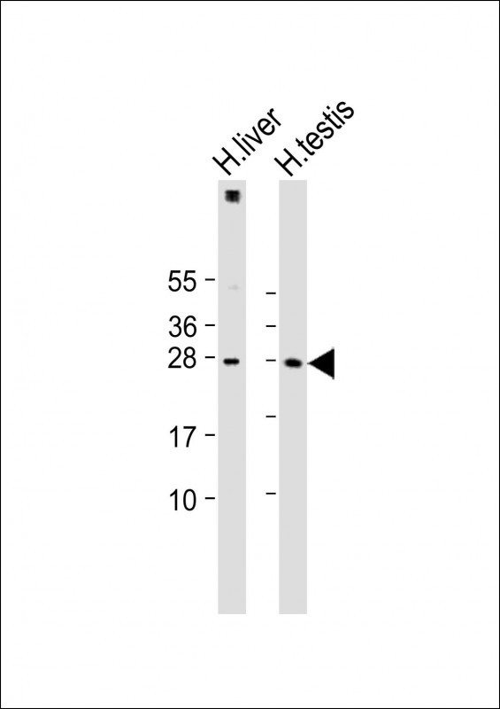 All lanes : Anti-LIN28B Antibody (N-term) at 1:2000 dilution Lane 1: human liver lysate Lane 2: human testis lysate Lysates/proteins at 20 μg per lane. Secondary Goat Anti-Rabbit IgG, (H+L), Peroxidase conjugated at 1/10000 dilution. Predicted band size : 27 kDa Blocking/Dilution buffer: 5% NFDM/TBST.