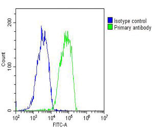 Overlay histogram showing HepG2 cells stained with APR04030G (green line). The cells were fixed with 2% paraformaldehyde (10 min) and then permeabilized with 90% methanol for 10 min. The cells were then icubated in 2% bovine serum albumin to block non-specific protein-protein interactions followed by the antibody (APR04030G, 1:25 dilution) for 60 min at 37?C. The secondary antibody used was Goat-Anti-Rabbit IgG, DyLight? 488 Conjugated Highly Cross-Adsorbed(OH191631) at 1/200 dilution for 40 min at 37?C. Isotype control antibody (blue line) was rabbit IgG (1μg/1x10^6 cells) used under the same conditions. Acquisition of >10, 000 events was performed.