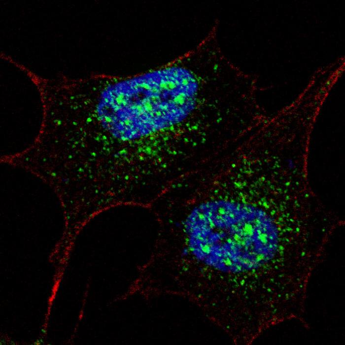 Fluorescent confocal image of SY5Y cells stained with APR04034G NANOG (S285) antibody. SY5Y cells were fixed with 4% PFA (20 min), permeabilized with Triton X-100 (0.2%, 30 min), then incubated with APR04034G NANOG (S285) primary antibody (1:200, 2 h at room temperature). For secondary antibody, Alexa Fluor? 488 conjugated donkey anti-rabbit antibody (green) was used (1:1000, 1h). Cytoplasmic actin was counterstained with Alexa Fluor? 555 (red) conjugated Phalloidin (5.25 μM, 25 min). Nuclei were counterstained with Hoechst 33342 (blue) (10 μg/ml, 3 min). Nanog immunoreactivity is localized mainly to the nuclei and also to the cytoplasm. |