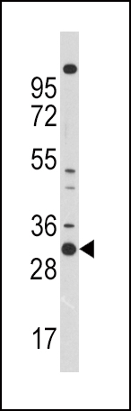 Western blot analysis of CDC2 Antibody (N-term) in 293 cell line lysates (35ug/lane). CDC2 (arrow) was detected using the purified Pab.