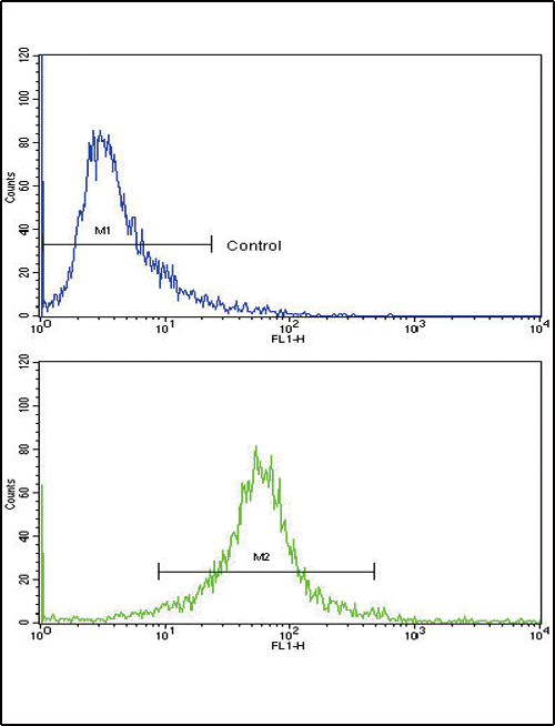Flow cytometric analysis of 293 cells using CDC2 Antibody (N-term)(bottom histogram) compared to a negative control cell (top histogram). FITC-conjugated goat-anti-rabbit secondary antibodies were used for the analysis. |