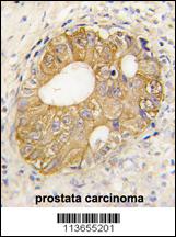 Formalin-fixed and paraffin-embedded human prostata carcinoma tissue reacted with CDH3 antibody (N-term) (Cat.APR04051G), which was peroxidase-conjugated to the secondary antibody, followed by DAB staining. This data demonstrates the use of this antibody for immunohistochemistry; clinical relevance has not been evaluated.