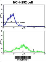 Flow cytometric analysis of NCI-H292 cells using CDH3 Antibody (N-term)(bottom histogram) compared to a negative control cell (top histogram). FITC-conjugated goat-anti-rabbit secondary antibodies were used for the analysis. |