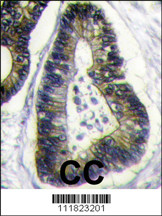 Formalin-fixed and paraffin-embedded human colon carcinoma reacted with FUBI Antibody (N-term)(Cat.APR04060G), which was peroxidase-conjugated to the secondary antibody, followed by DAB staining. This data demonstrates the use of this antibody for immunohistochemistry; clinical relevance has not been evaluated. |
