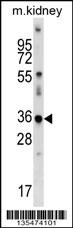 Mouse Cdkl4 Antibody (C-term) (Cat. APR04069G) western blot analysis in mouse kidney tissue lysates (35ug/lane).This demonstrates the Cdkl4 antibody detected the Cdkl4 protein (arrow). |