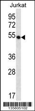 WDR40A Antibody (Center) (Cat. APR04080G) western blot analysis in Jurkat cell line lysates (35ug/lane).This demonstrates the WDR40A antibody detected the WDR40A protein (arrow). |