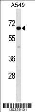 CLPTM1L Antibody (C-term) (Cat. APR04084G) western blot analysis in A549 cell line lysates (35ug/lane).This demonstrates the CLPTM1L antibody detected the CLPTM1L protein (arrow). |