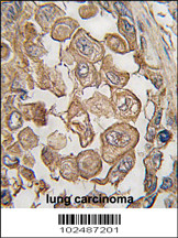 Formalin-fixed and paraffin-embedded human lung carcinoma tissue reacted with SIGLEC11 antibody (N-term) (Cat.APR04093G), which was peroxidase-conjugated to the secondary antibody, followed by DAB staining. This data demonstrates the use of this antibody for immunohistochemistry; clinical relevance has not been evaluated. |