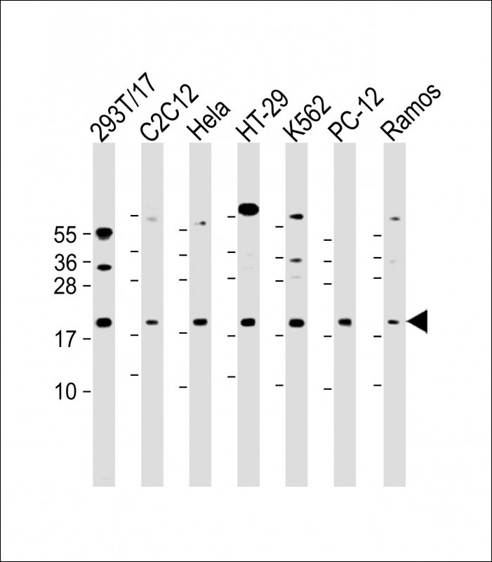 All lanes : Anti-KRAS Antibody (C-term) at 1:2000 dilution Lane 1: 293T/17 whole cell lysate Lane 2: C2C12 whole cell lysate Lane 3: Hela whole cell lysate Lane 4: HT-29 whole cell lysate Lane 5: K562 whole cell lysate Lane 5: PC-12 whole cell lysate Lane 5: Ramos whole cell lysate Lysates/proteins at 20 μg per lane. Secondary Goat Anti-Rabbit IgG, (H+L), Peroxidase conjugated at 1/10000 dilution. Predicted band size : 22 kDa Blocking/Dilution buffer: 5% NFDM/TBST.