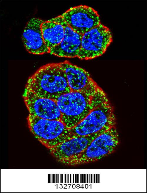 Confocal immunofluorescent analysis of KRAS Antibody (C-term)( APR04099G) with WiDr cell followed by Alexa Fluor 488-conjugated goat anti-rabbit lgG (green).Actin filaments have been labeled with Alexa Fluor 555 phalloidin (red).DAPI was used to stain the cell nuclear (blue).