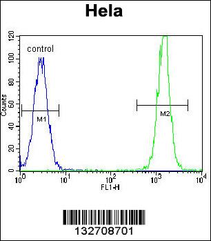 KRAS Antibody (C-term) (Cat. APR04099G) flow cytometric analysis of Hela cells (right histogram) compared to a negative control cell (left histogram).FITC-conjugated goat-anti-rabbit secondary antibodies were used for the analysis. |