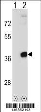 Western blot analysis of PRPS2 (arrow) using rabbit polyclonal PRPS2 Antibody (Center) (Cat. APR04104G). 293 cell lysates (2 ug/lane) either nontransfected (Lane 1) or transiently transfected (Lane 2) with the PRPS2 gene. |