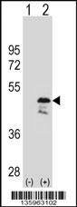 Western blot analysis of OLA1 (arrow) using rabbit polyclonal OLA1 Antibody (N-term) (Cat. APR04110G). 293 cell lysates (2 ug/lane) either nontransfected (Lane 1) or transiently transfected (Lane 2) with the OLA1 gene. |