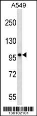 CCDC141 Antibody (N-term) (Cat. APR04115G) western blot analysis in A549 cell line lysates (35ug/lane).This demonstrates the CCDC141 antibody detected the CCDC141 protein (arrow). |