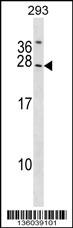 SYNGR2 Antibody (N-term) (Cat. APR04122G) western blot analysis in 293 cell line lysates (35ug/lane).This demonstrates the SYNGR2 antibody detected the SYNGR2 protein (arrow). |