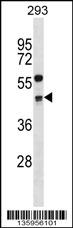 CCNG2 Antibody (Center) (Cat. APR04128G) western blot analysis in 293 cell line lysates (35ug/lane).This demonstrates the CCNG2 antibody detected the CCNG2 protein (arrow). |