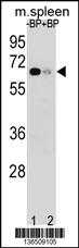 Western blot analysis of ASB3 Antibody (N-term) Pab (Cat. APR04135G) pre-incubated without(lane 1) and with(lane 2) blocking peptide in mouse spleen tissue lysate. ASB3 Antibody (N-term) (arrow) was detected using the purified Pab. |