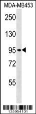 FBXO11 Antibody (N-term) (Cat. APR04154G) western blot analysis in MDA-MB453 cell line lysates (35ug/lane).This demonstrates the FBXO11 antibody detected the FBXO11 protein (arrow). |