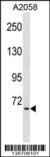 TNIP1 Antibody (C-term) (Cat. APR04160G) western blot analysis in A2058 cell line lysates (35ug/lane).This demonstrates the TNIP1 antibody detected the TNIP1 protein (arrow). |