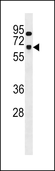 SNRNP70 Antibody (Center) (Cat. APR04166G) western blot analysis in CEM cell line lysates (35ug/lane).This demonstrates the SNRNP70 antibody detected the SNRNP70 protein (arrow). |