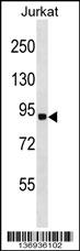 RNF10 Antibody (N-term) (Cat. APR04171G) western blot analysis in Jurkat cell line lysates (35ug/lane).This demonstrates the RNF10 antibody detected the RNF10 protein (arrow). |