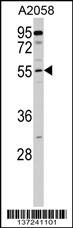 CNDP2 Antibody (C-term) (Cat. APR04176G) western blot analysis in A2058 cell line lysates (35ug/lane).This demonstrates the CNDP2 antibody detected the CNDP2 protein (arrow). |