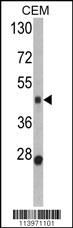 Western blot analysis of BMP15 Antibody (Center) (Cat. APR04178G) in CEM cell line lysates (35ug/lane). BMP15 (arrow) was detected using the purified Pab.